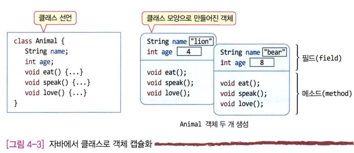 - 캡슐화: 외부와의 접속을 위해 몇 부분만을 공개 노출. 클래스(class)는 객체의 모양을 선언한 틀이며 클래스 모양 그대로 생성된 실체(instance)가 객체. 클래스 내에 필드(field)와 메소드(method)를 모두 구현. 캡슐화를 통해 객체 내 필드에 대한 외부로부터의 접근 제한