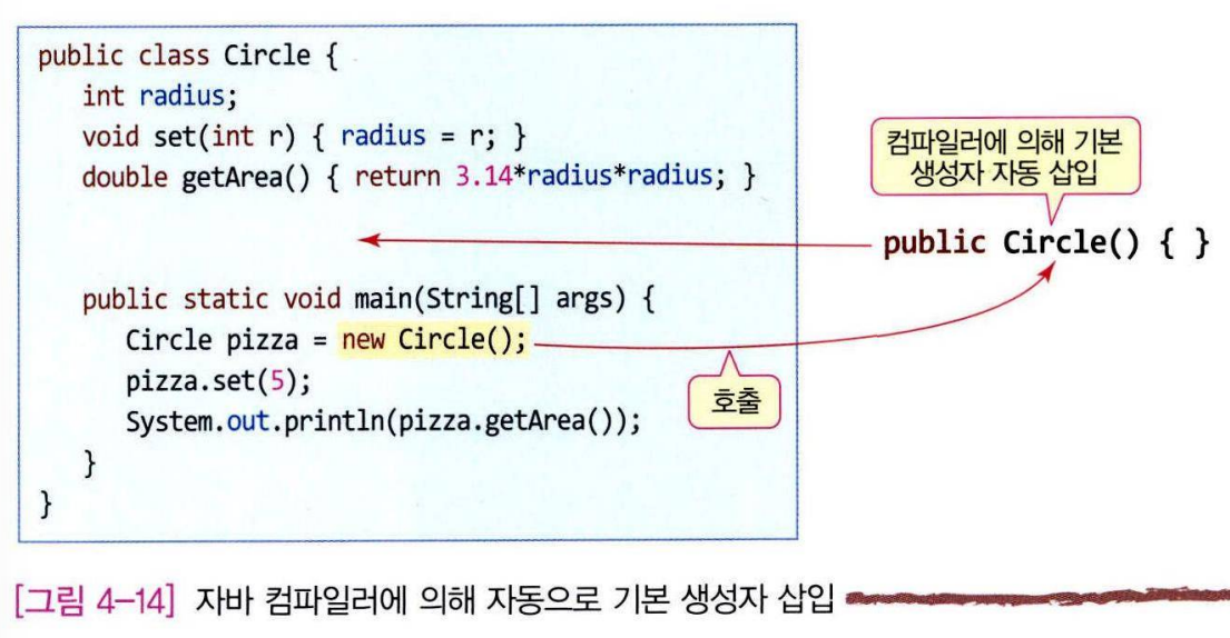 - 기본생성자(디폴트 생성자): 매개변수가 없고 실행코드가 없어 아무 일도 하지 않고 단순 리턴하는 생성자.