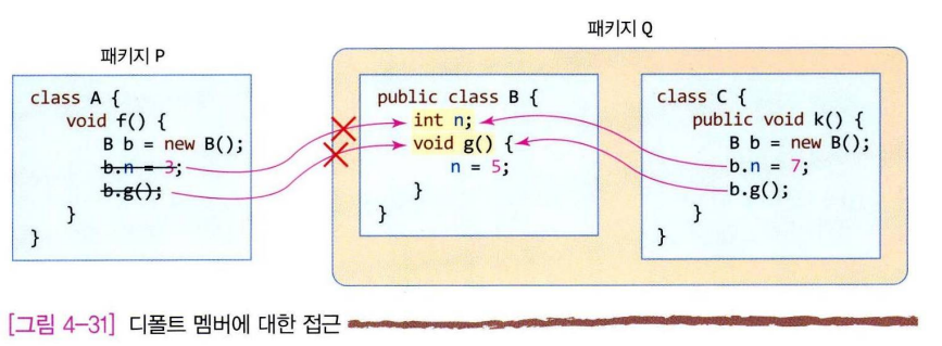- 디폴트 접근 지정: 접근 지정자 생략 - 동일한 패키지 내의 모든 클래스에서 호출가능