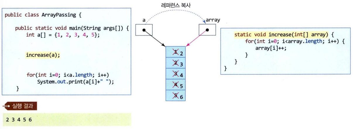 - 배열이 통째로 전달되는 것이 아니라 배열에 대한 레퍼런스만 전달