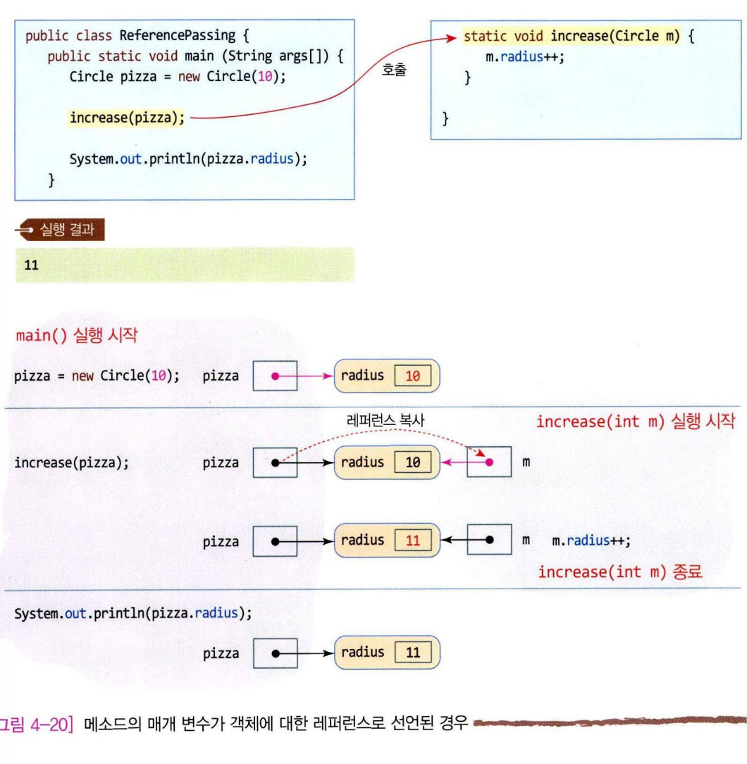- increase(pizza); 호출문에 의해 increase(Circle m)가 호출되면 매개변수 m이 생기고, pizza변수에 저장된 값(레퍼런스)가 m에 복사되어 m은 pizza가 가리키는 객체를 함께 가리킨다.