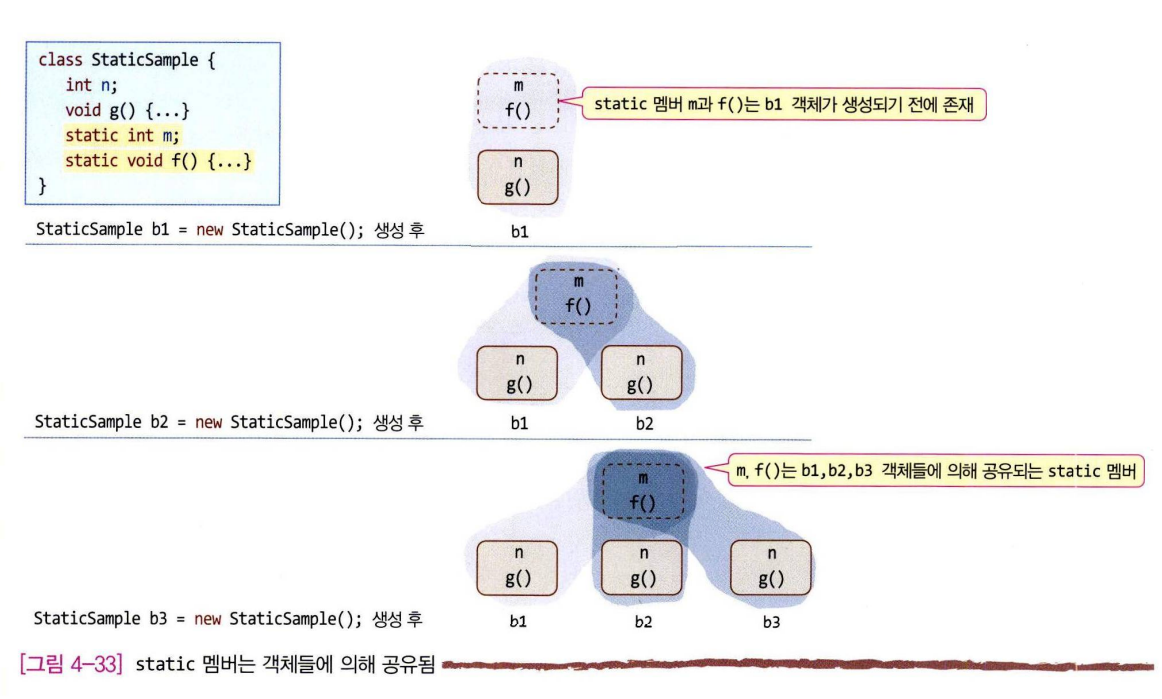 - static 멤버는 프로그램을 시작할때나 클래스 로딩 시에 생성. 객체 생성 전에도 static 멤버는 사용할 수 있으며 생성된 객체가 소멸된 후에도 여전히 살아 공간을 차지하고 있음. 프로그램 종료 시 함께 소멸.