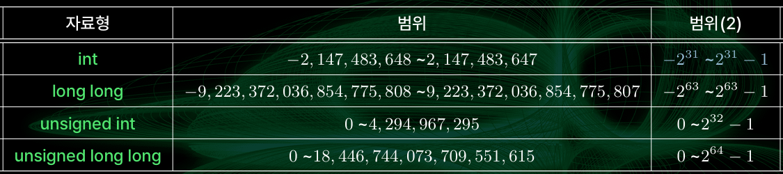 1. 정수형: int, long long, unsigned int, unsigned long long