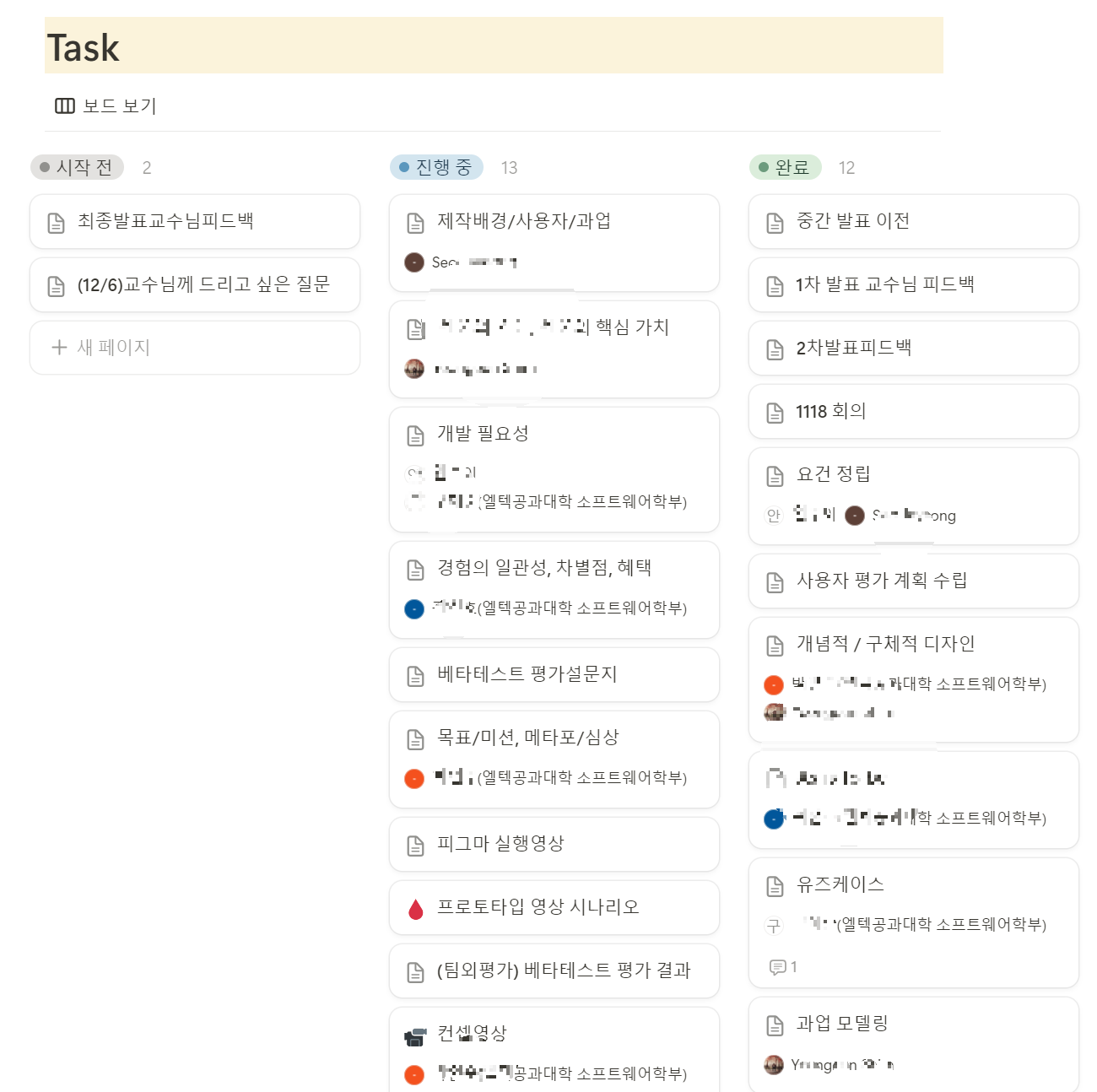 Notion을 주로 활용하여 일정을 게시하고 자료와 각자 맡은 파트 결과물을 공유하였다.