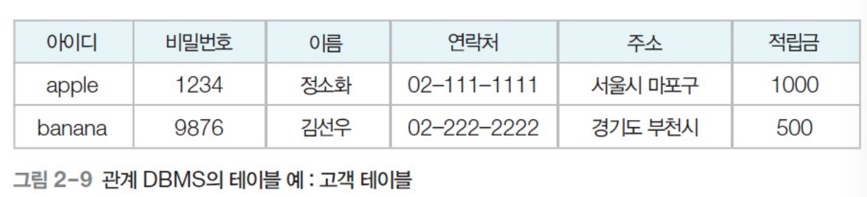 - 관계 DBMS : 데이터베이스를 테이블 형태로 구성