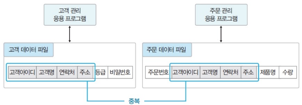 - 저장공간의 낭비 + 데이터 일관성과 데이터 무결성을 유지하기 어렵다. ex) 연락처를 고객데이터파일에서만 수정하고 실수로 주문데이터 파일에서 수정하지 않는 경우