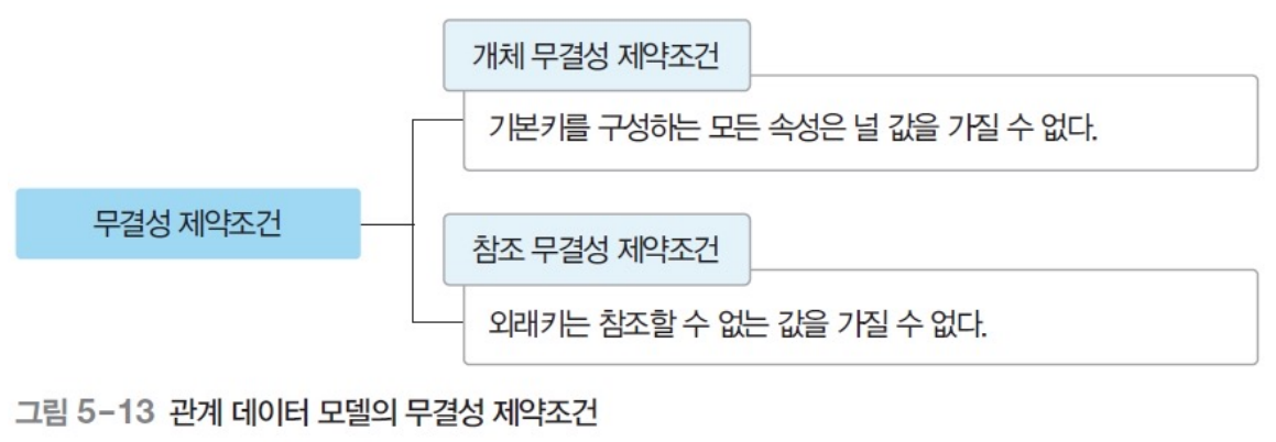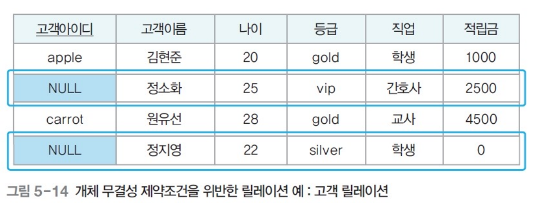 - 기본키를 구성하는 모든 속성은 널값을 가질 수 없는 규칙