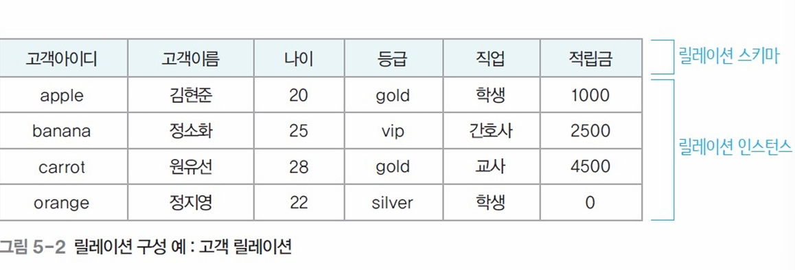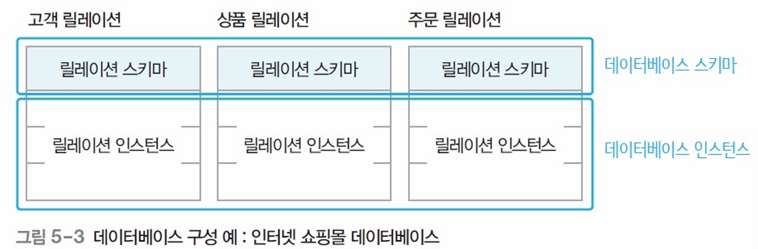 - 데이터베이스를 구성하는 릴레이션 인스턴스의 모음