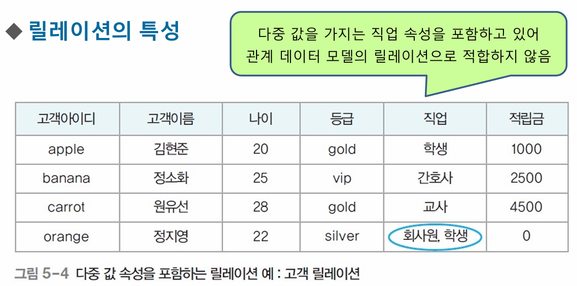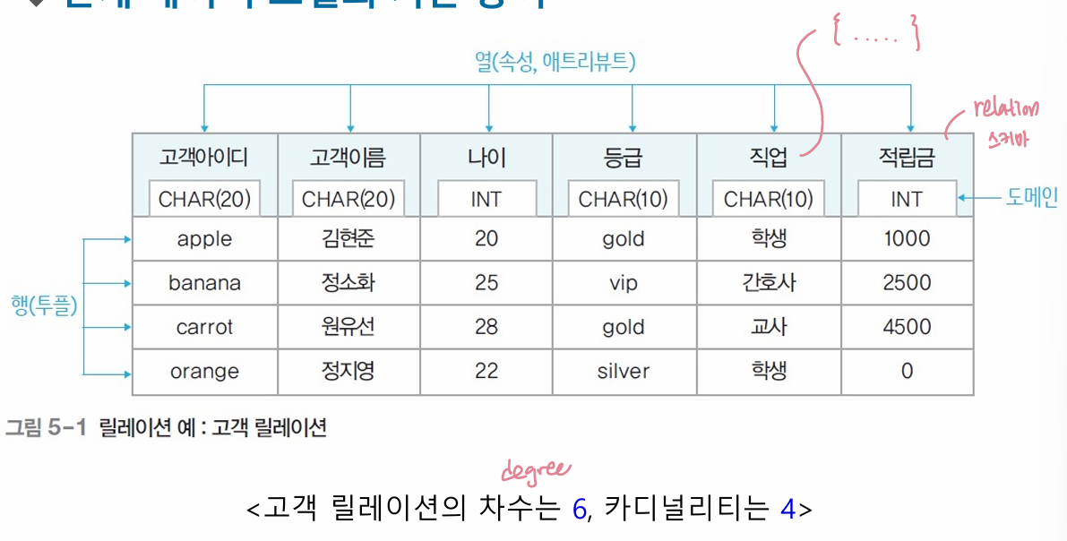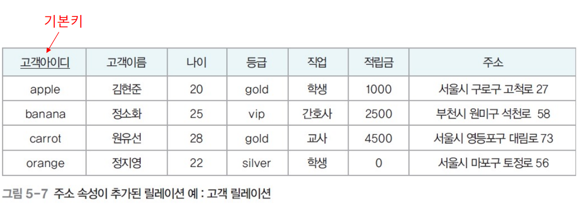 - 예) 고객(고객아이디, 고객이름, 나이, 등급, 직업, 적립금)