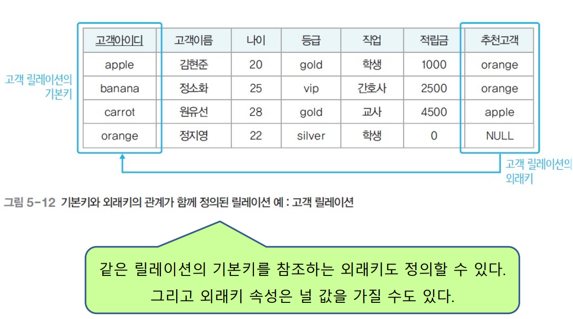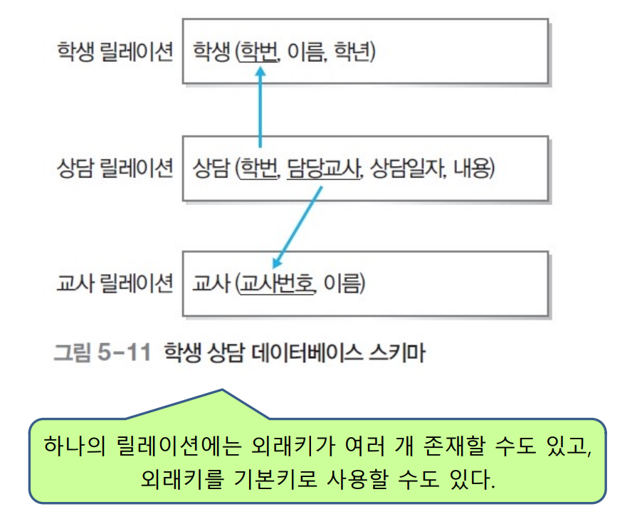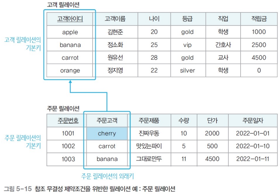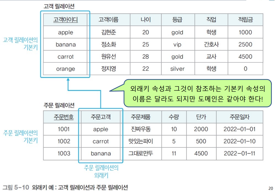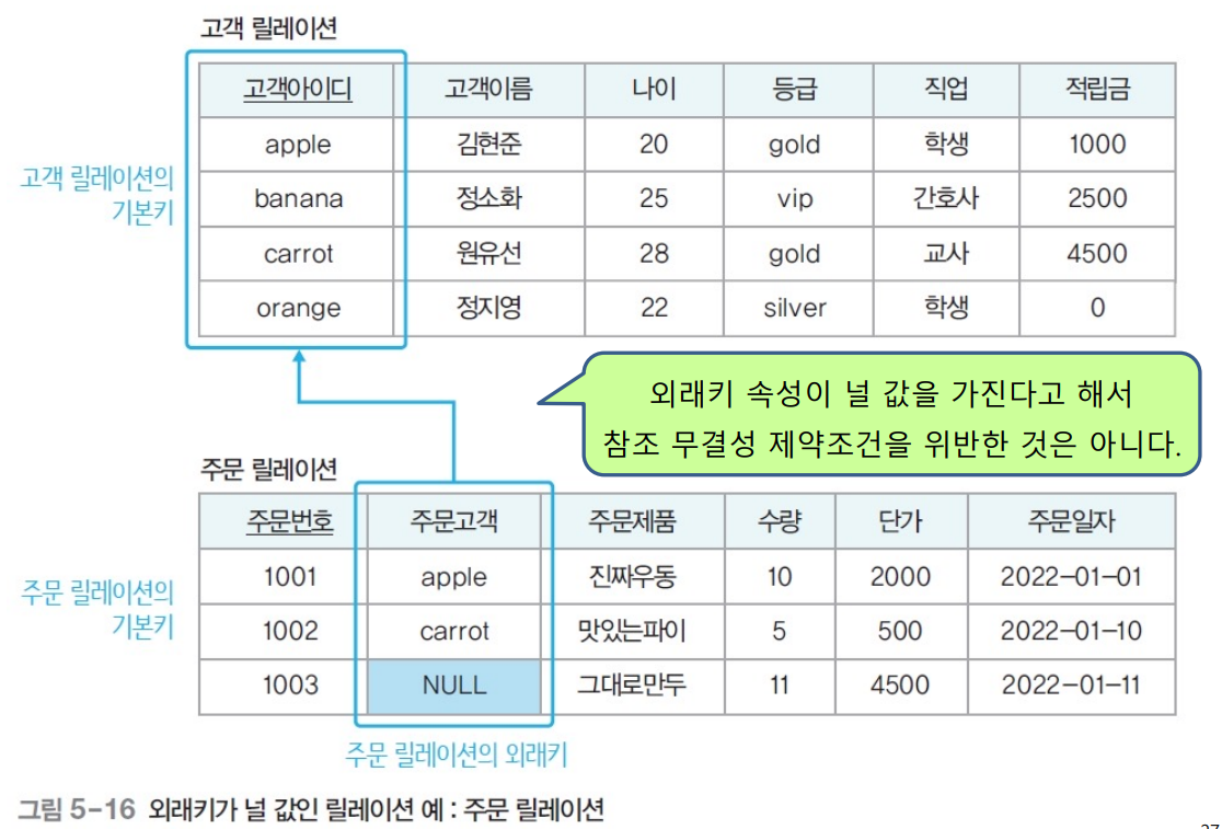 - 참조되는 릴레이션 : 외래키가 참조하는 기본키를 가진 릴레이션