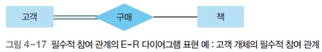 - ex) 고객개체가 책 개체와의 구매 관계에 필수참여 - 모든 고객은 책을 반드시 구매해야 한다.