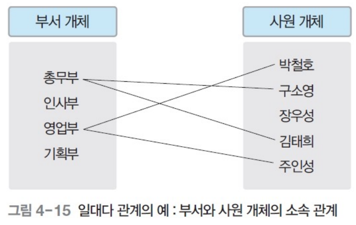 - 개체 A의 각 개체 인스턴스가 개체 B의 개체 인스턴스 여러 개와 관계 맺을 수 있음. 또 개체 B의 각 개체 인스턴스도 개체 A의 개체 인스턴스 여러 개와 관계를 맺을 수 있음.