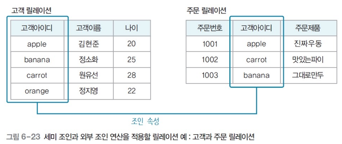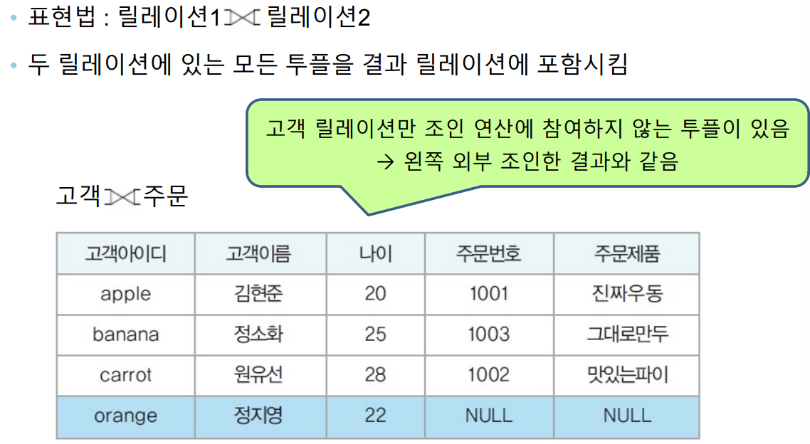 - ex) 자연조인 연산을 확장한 세미조인과 외부조인