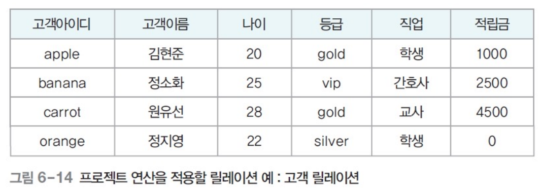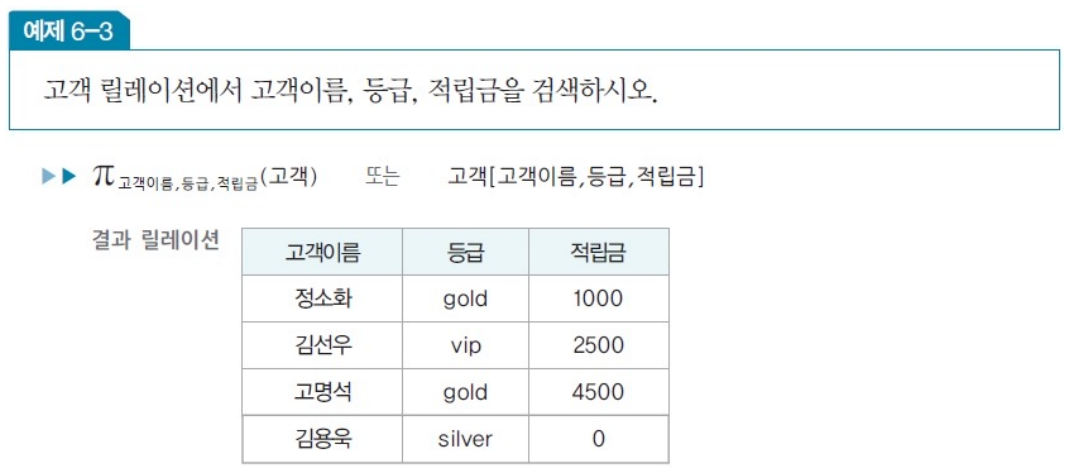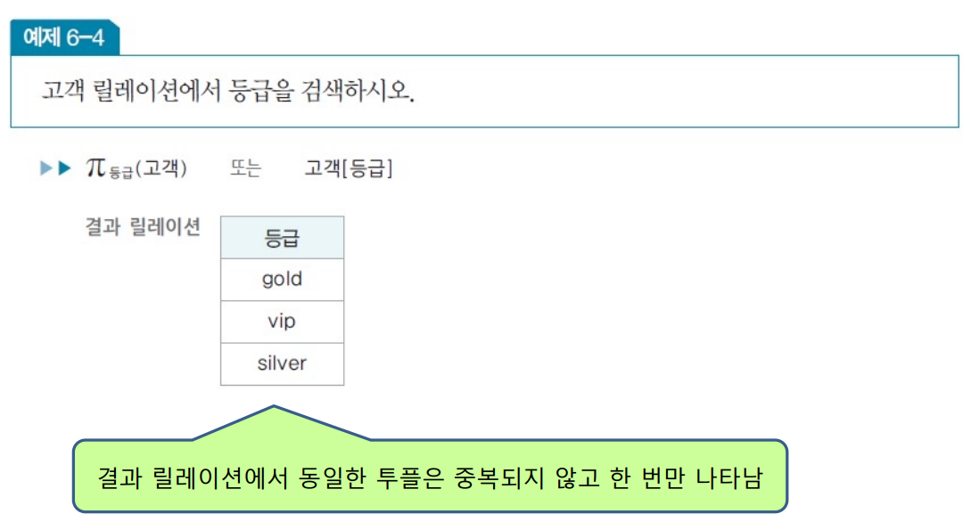 - 릴레이션에서 선택한 속성의 값으로 결과 릴레이션 구성