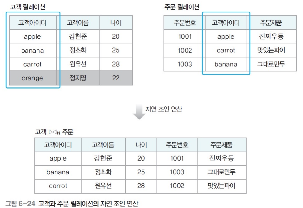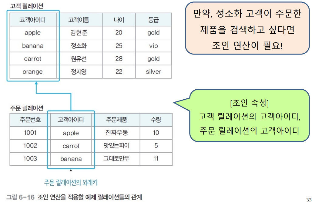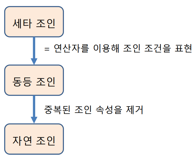 - 조인 속성을 이용해 두 릴레이션 조합 -> 결과 릴레이션 구성