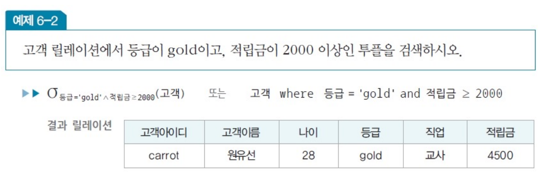 - 릴레이션에서 조건을 만족하는 투플만 선택 -> 결과 릴레이션 구성