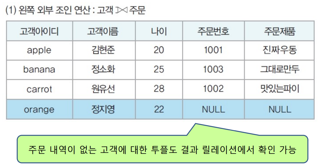 - 자연조인연산에서 제외되는 투플도 결과 릴레이션에 포함시키는 조인