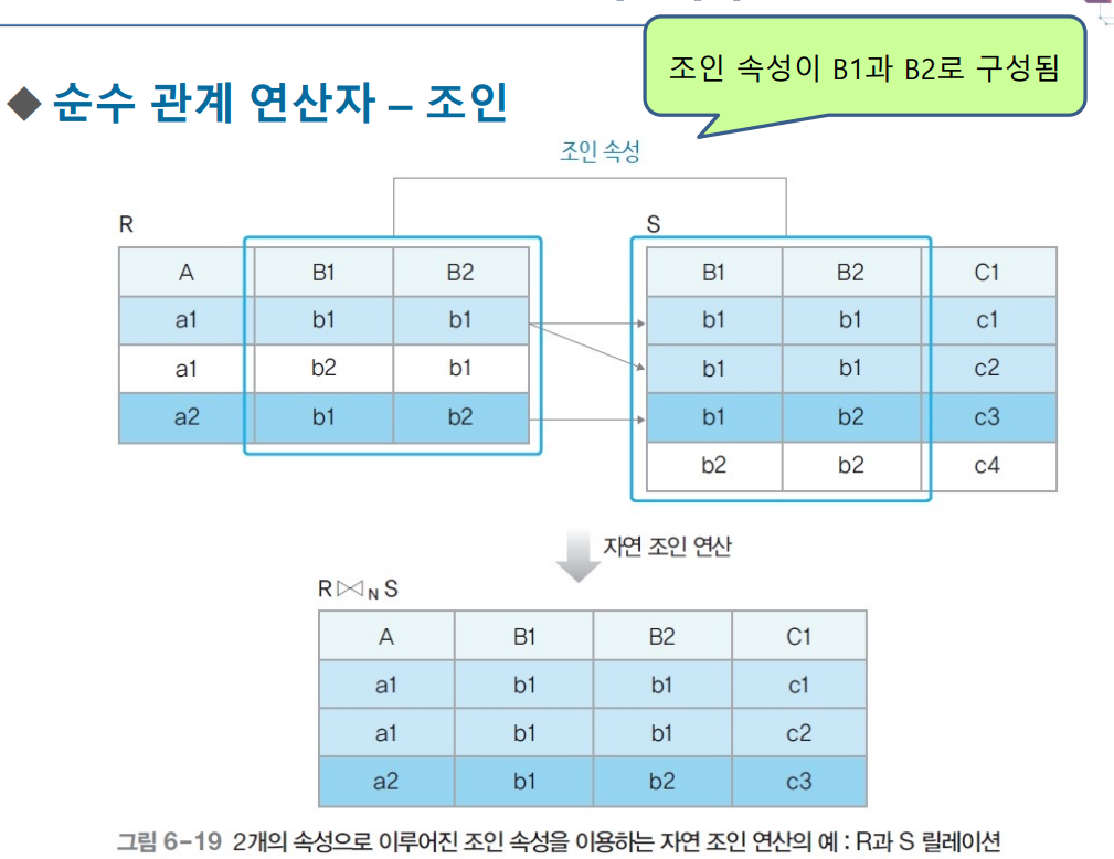 - 조인속성 : 두 릴레이션이 공통으로 갖고 있는 속성