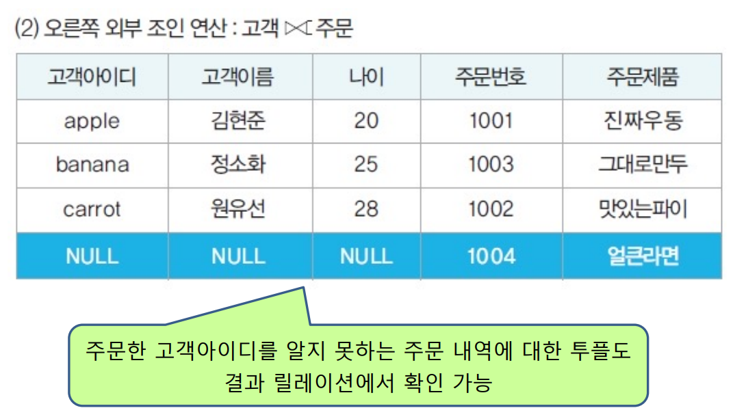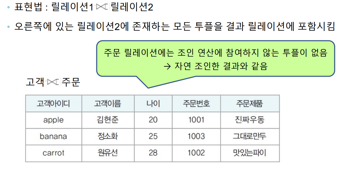 - 릴레이션2의 모든 투플과 관련이 있는 릴레이션 1의 투플로 결과 릴레이션 구성