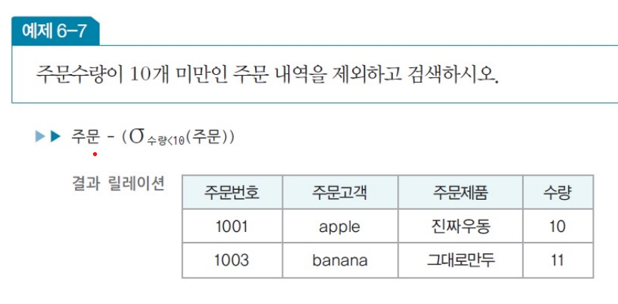 - 수학적 표현 : σ조건식(릴레이션) --> 시험에서 관계대수에 대해 물어볼 땐 얘 사용!