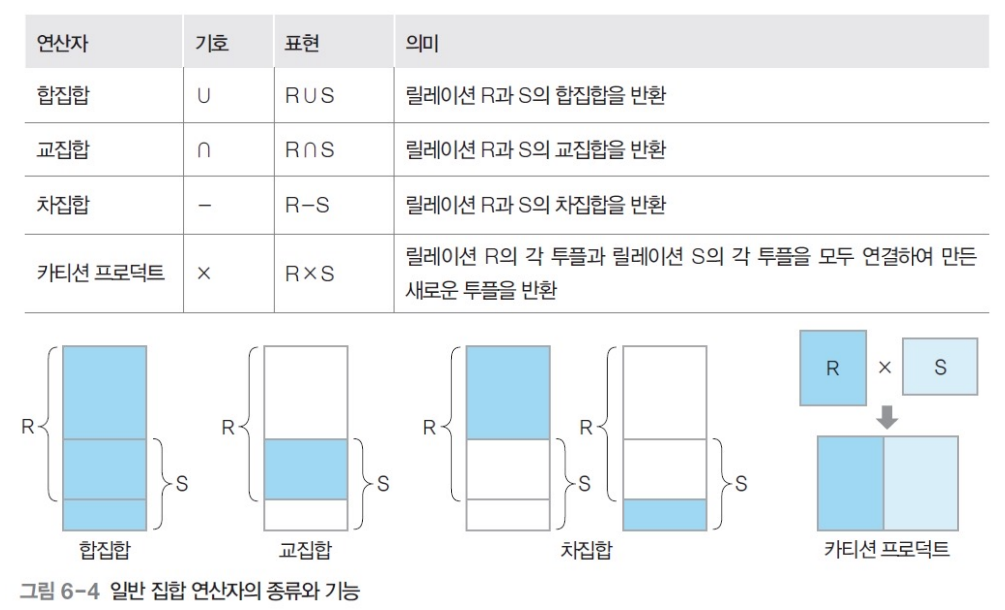 - 피연산자가 2개 필요 : 2개의 릴레이션을 대상으로 연산 수행