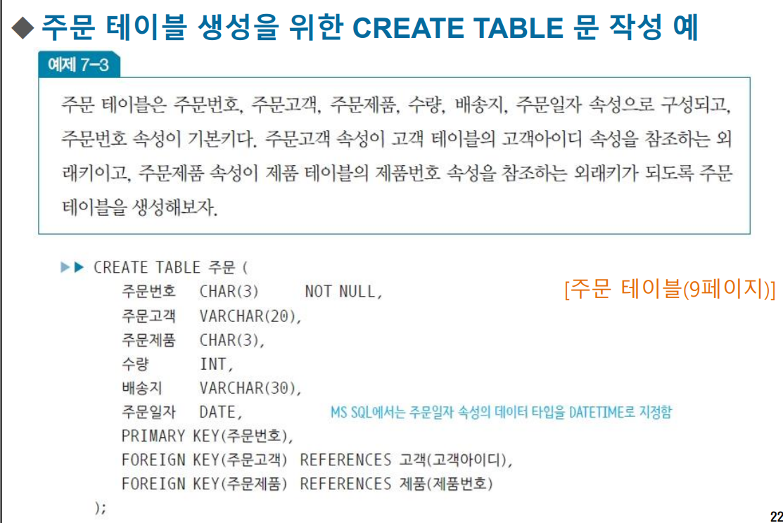 - ex. PRIMARY KEY(고객아이디), PRIMARY KEY(주문고객, 주문제품)