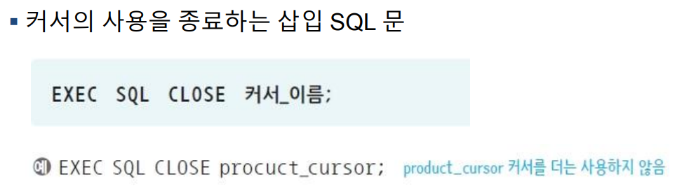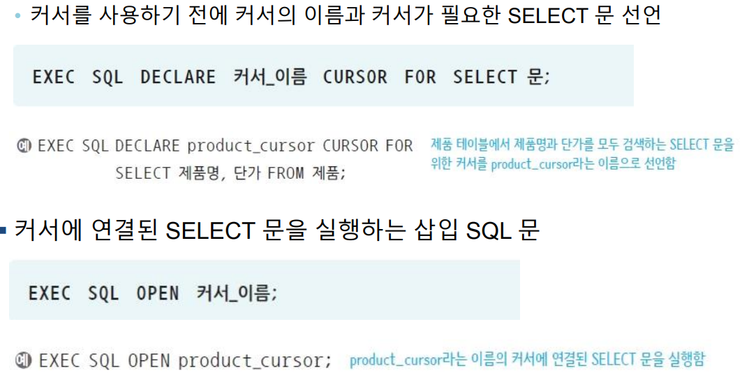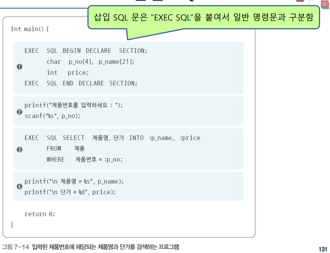 - 일반 명령문과 구별하기 위해 삽입 SQL 문 앞에 EXEC SQL을 붙임