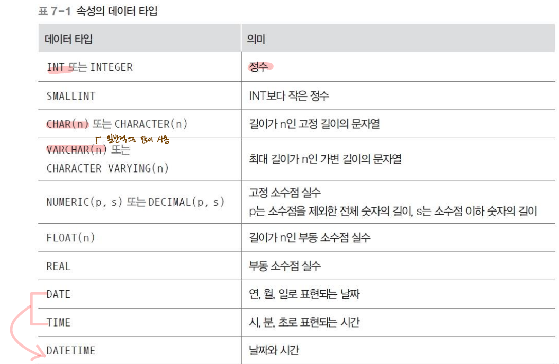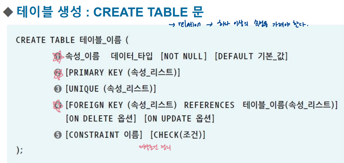 - 테이블 구성하는 각 속성의 이름, 데이터 타입, 기본 제약사항 정의