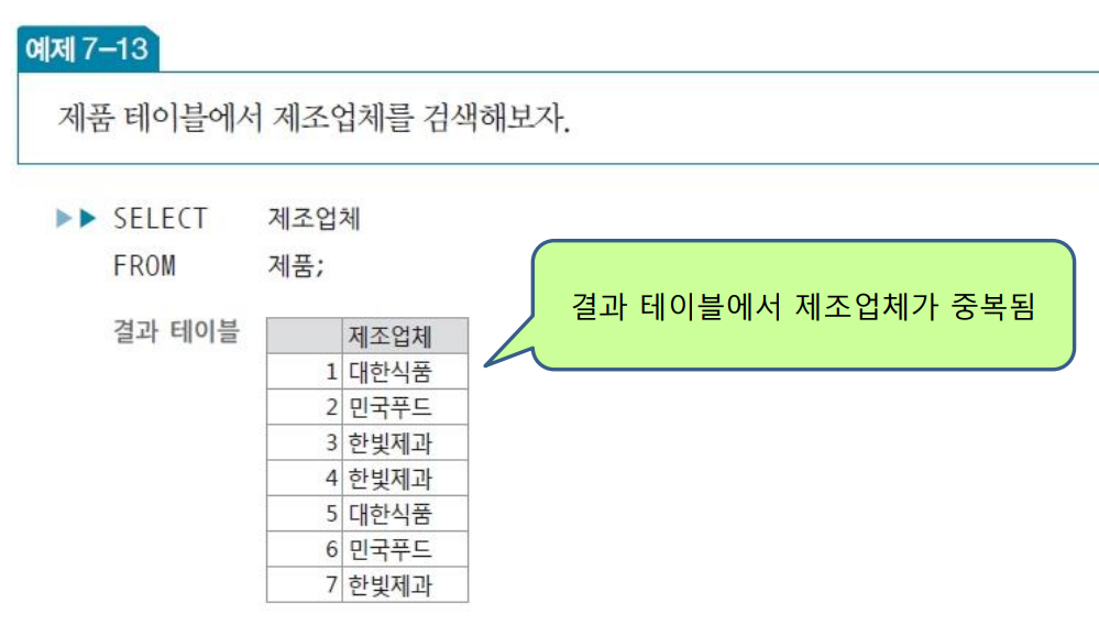 DISTINCT : 결과 테이블이 투플의 중복을 허용하지 않도록 지정*/