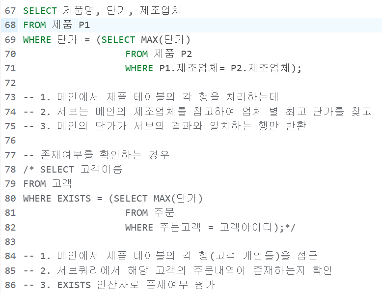 -- 2. 서브는 메인의 제조업체를 참고하여 업체 별 최고 단가를 찾고
