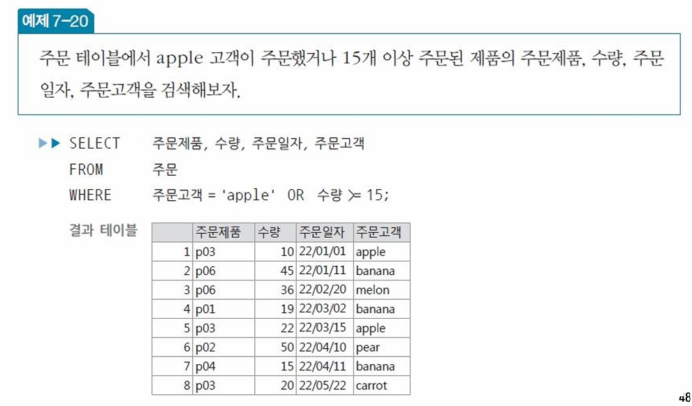 - WHERE 키워드와 함께 비교연산자와 논리연산자를 이용한 검색조건 제시