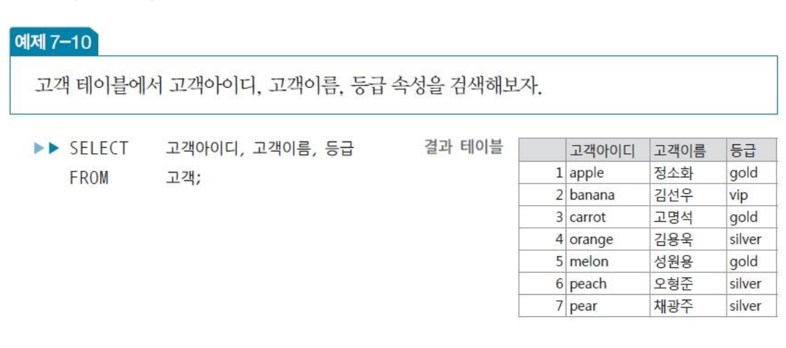 - SELECT 키워드와 함께 검색하고 싶은 속성의 이름 나열