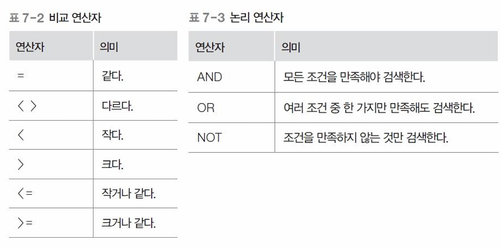 - WHERE 키워드와 함께 비교연산자와 논리연산자를 이용한 검색조건 제시