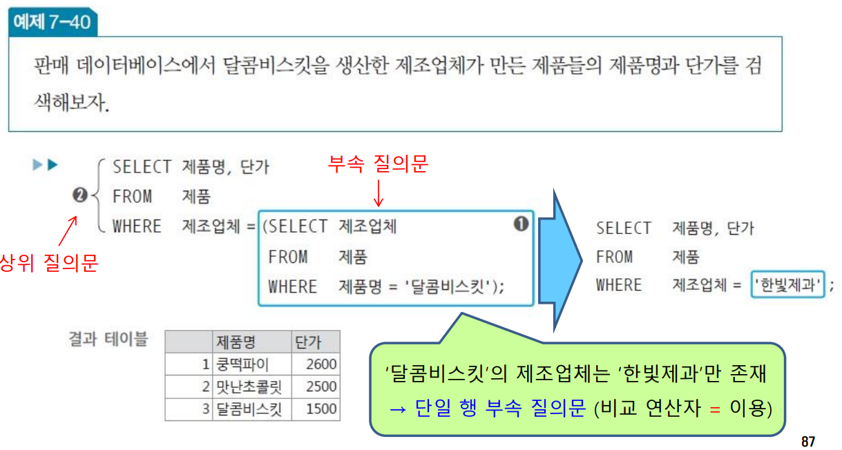 -- 스칼라 부속질의 : 부속질의의 결과 ㄱ밧이 단일 값이 단일 행, 단일 열로 반환
