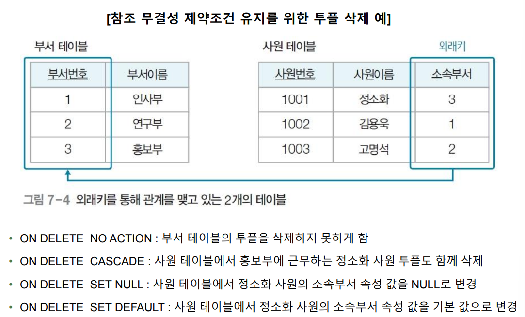 - ex) FOREIGN KEY(소속부서) REFERENCES 부서(부서번호) ON DELETE(or UPDATE) CASCADE